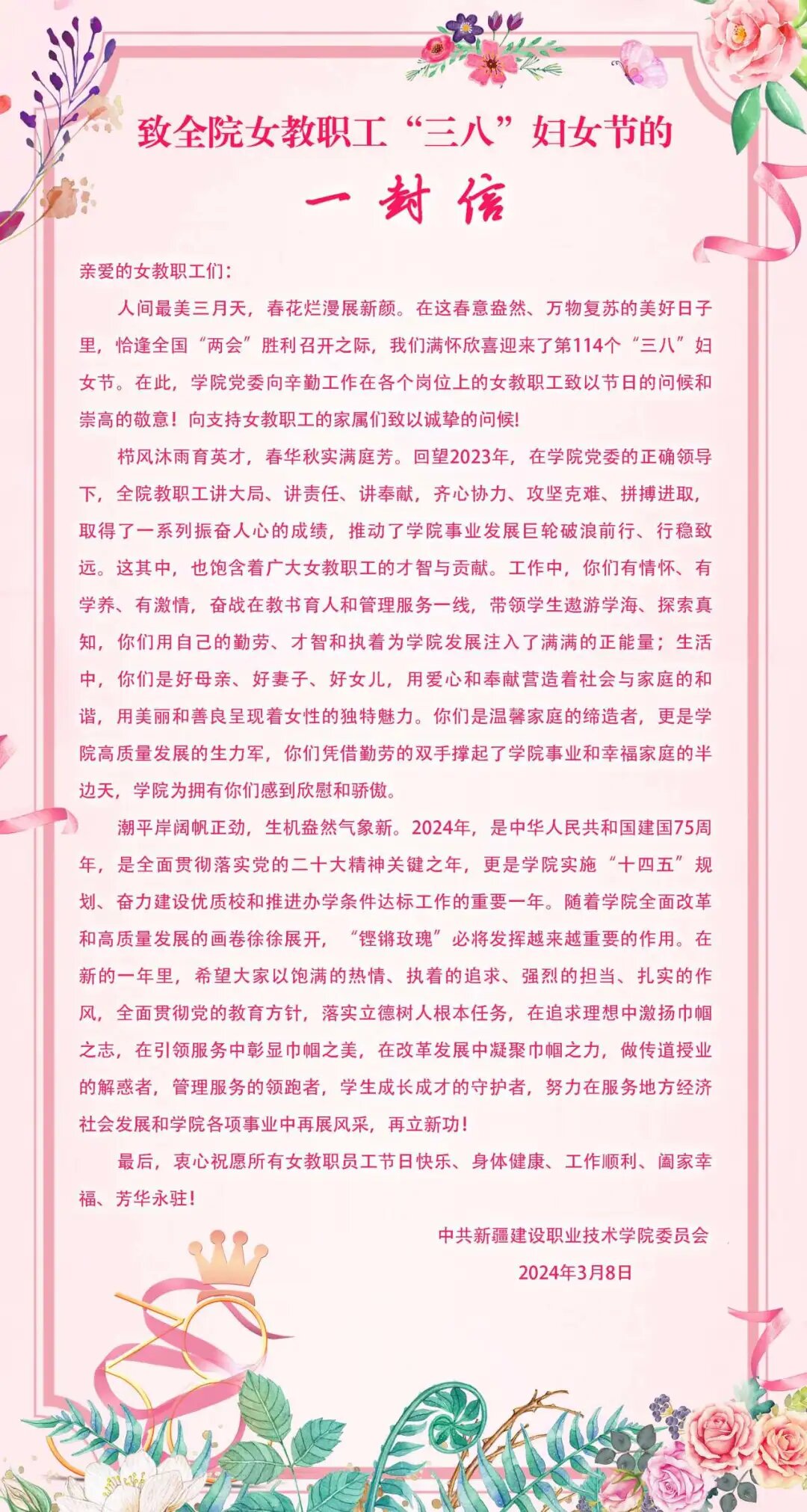 致全院女教职工“三八”妇女节的一封信